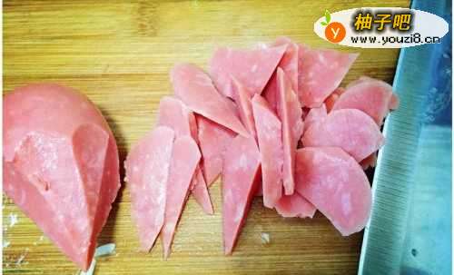 4将准备好的火腿剥去外包装,用滚刀切法,将火腿切成小片状,滚刀切法比较好切,平切火腿薄片,会比较粘菜刀,将切好的火腿装盘备用。