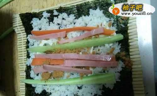 3把海苔铺在干净的餐桌板上或是竹子上,先添加一层米饭,再加上提前准备好的黄瓜、火腿等材料。