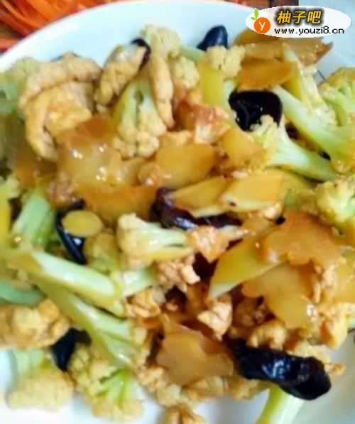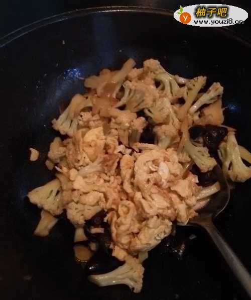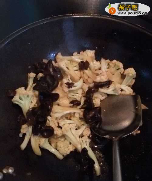 9将木耳倒入锅中,和菜花一起炒。