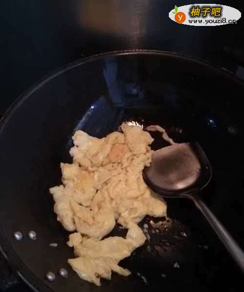 4锅中放油,油热后,放入鸡蛋,用铲子搅成均匀的小块,炒熟后,先盛入碗中。