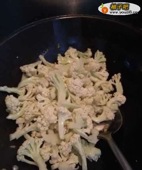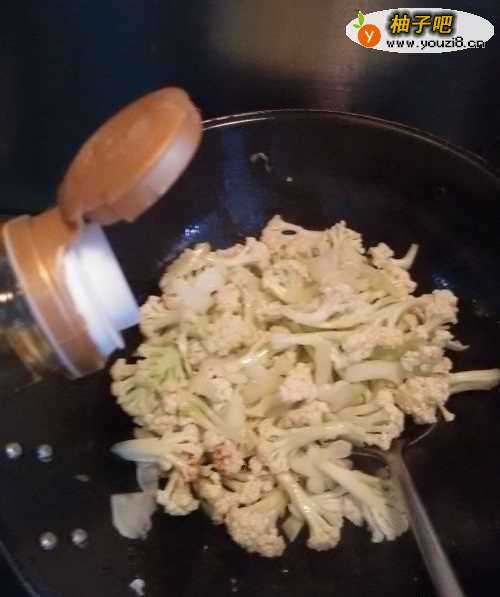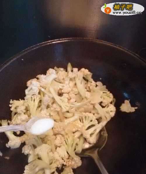 8根据自己的口味,加入适量的盐,菜花比较吸盐,可以稍微多放一点。