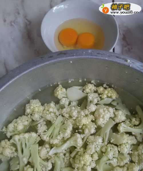 2将菜花分成小朵,用盐水泡一泡,可以去掉尘土和细菌,将鸡蛋打入碗中。