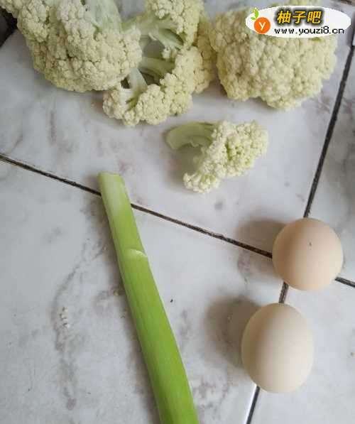 准备菜花、两个鸡蛋和一根葱。