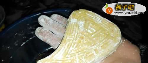 3把面团捏成合适的大小块状,将糯米饭包在中间。按在模具里面。