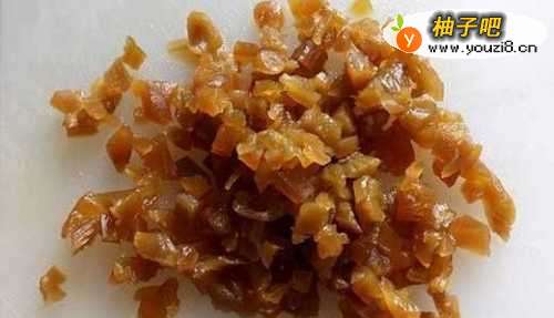 罐头菜心沥去汤汁,切成碎粒。