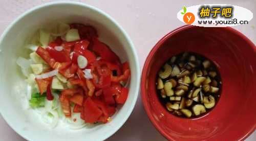 白菜洗干净斜切成薄片, 蒜切成蒜末,葱切一小段切碎,红色炮椒洗净切成条状。