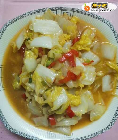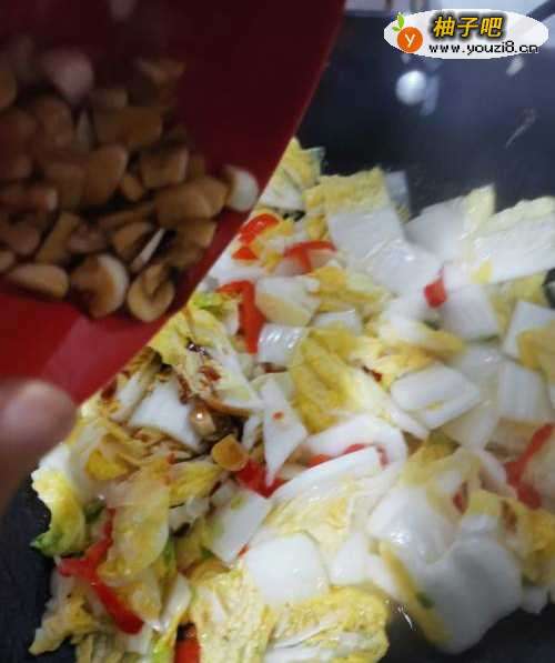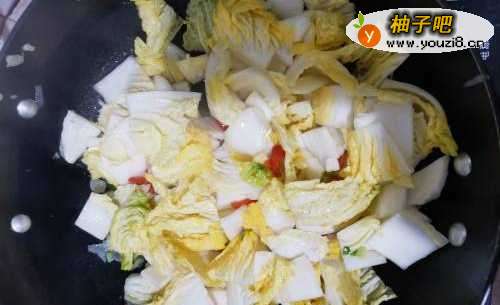 5等蒜、辣椒、葱 爆香后,加入白菜(时间不易过长,容易烧糊,影响味道);