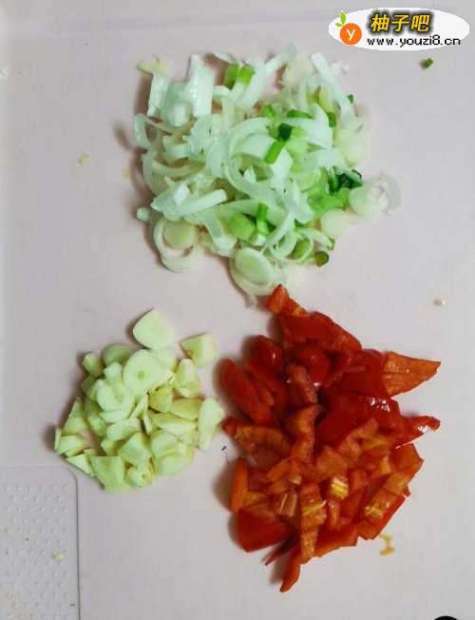 4起锅烧油,在油热到3成热时,把蒜末、红辣椒、葱丝倒入锅内爆香。