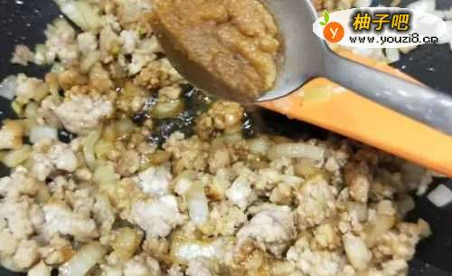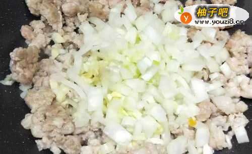 2绞肉炒到肉汁收,肉香还有猪油出来,放入洋葱末、蒜末、姜末继续炒出香味