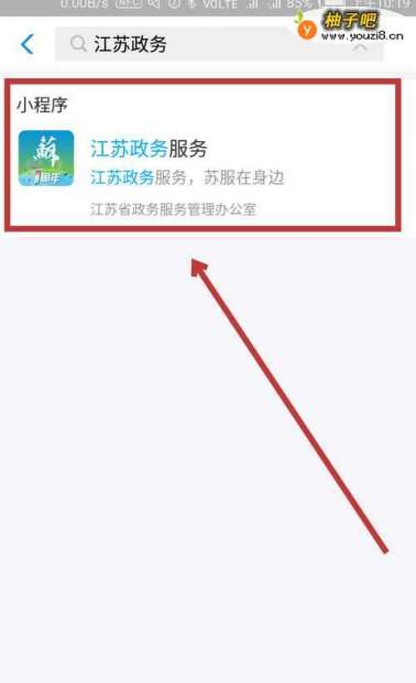 3然后在上方的搜索框内输入【江苏政务】,再点击下面的【江苏政务服务】,如图所示。
