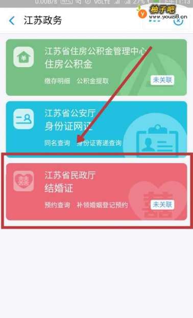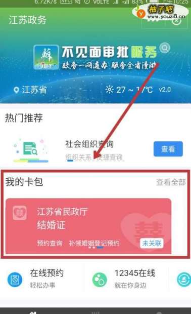 4进入到【江苏政务服务】中后,在【我的卡包】中找到【江苏省民政厅结婚证】,点击进入。