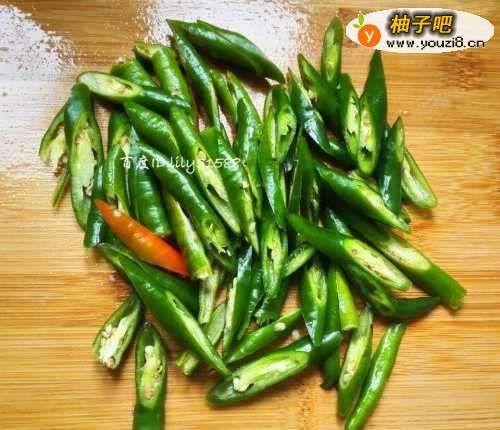 2尖椒洗干净,斜切好备用。