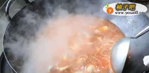33、锅内留少许五香油倒入葱姜蒜、辣豆瓣酱煸炒,加入香料、黄酒、酱油炒匀,冲入沸水烧开,放少许盐、胡椒粉、糖,调好味稍煮片刻,捞出香料;