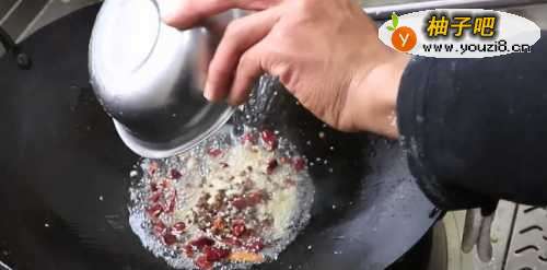 77、另起一锅把五香油倒一部分在锅里,放入花椒和干辣椒段,用小火炸出香味,辣椒的颜色稍变就关火,随即将热油浇在鱼片上即可;