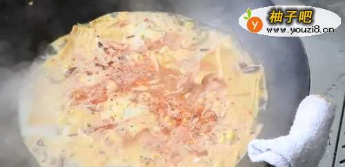 66、鱼片连汤汁一同放入装有配菜的锅仔里;