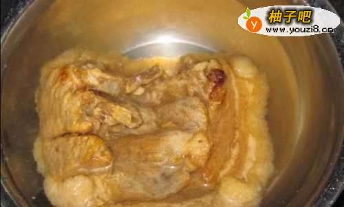 55、直到肉皮颜色金黄,油脂溢出,将肉块四面都煎一下至上色后捞出;