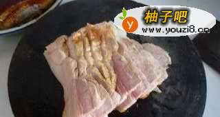 88、煎好的肉稍凉后切成片,肉皮向下,均匀排在饭碗中,上面铺上梅菜;