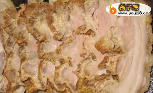 44、锅里抹薄薄一层油,将肉皮向下放入锅中,小火慢慢煎烤;