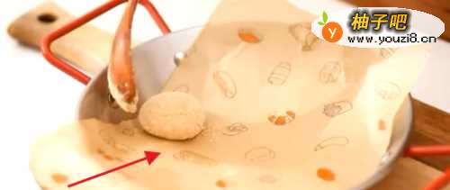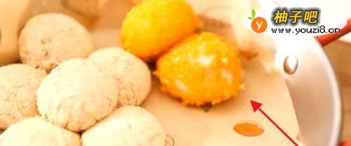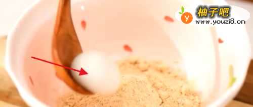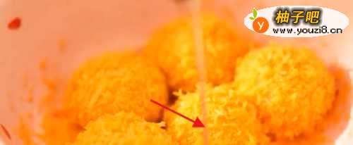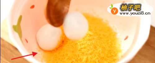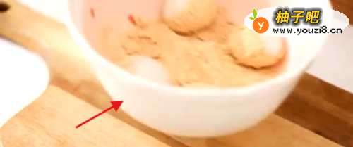 准备一包面包糠,放入煮熟的汤圆,摇晃均匀