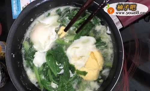 2烧小半锅水,煮开,敲入鸡蛋,用筷条轻轻搅动。放入油,加适量的盐,再次煮开。