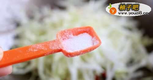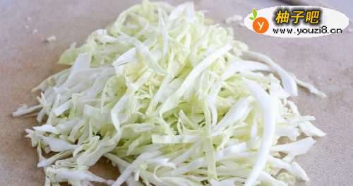 4包菜切成丝,红椒切成丝,小葱切成末,大蒜切成末;