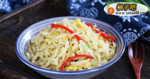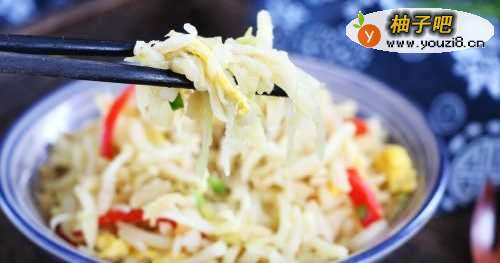 7放入土豆丝,放入鸡蛋末,葱末翻炒均匀;