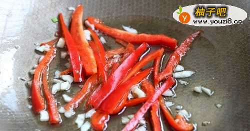 5锅内放适量的色拉油,放入大蒜末炒香,放入红椒丝翻炒,放入包菜丝翻炒均匀;