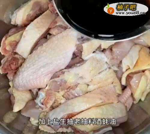 2把切好的鸡肉放进盘中,加入盐、生抽、老抽、料酒、蚝油,少许糖、胡椒粉。