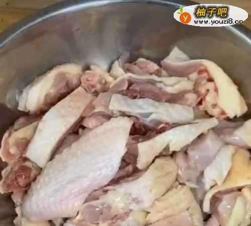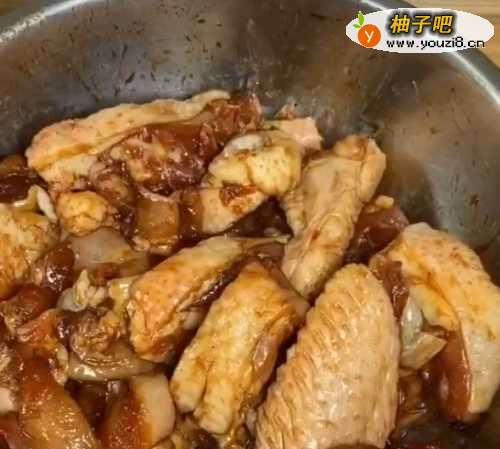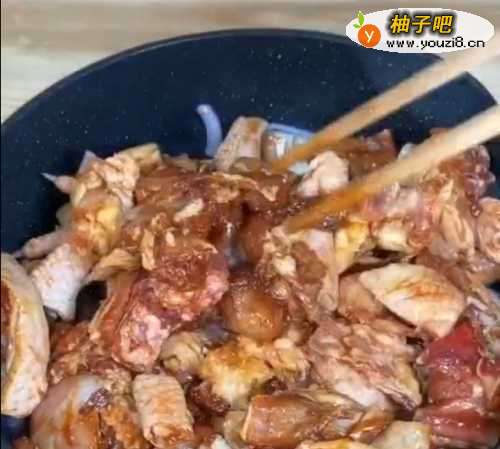 6最后倒入腌制好的鸡肉、150毫升啤酒。