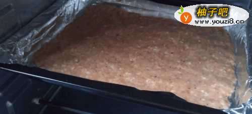 4烤盘上铺好锡纸,把肉末均匀的抹在上面,越薄越好,我是用一个小勺子,在勺子背面沾上少许的油,一点点抹平的。
