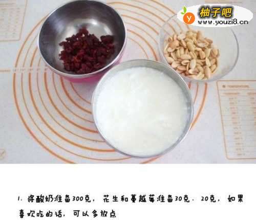 将酸奶准备300g,花生和蔓越莓准备30g、20g,如果喜欢吃的话,可以多放点