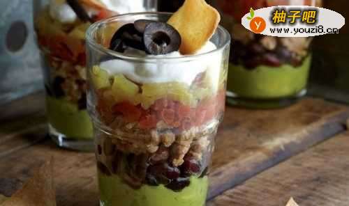6七层下降 如果你需要给一大群孩子准备一份零食,让他们吃一层一层的蘸酱似乎是顺理成章的事。这种百乐餐最受欢迎的是用希腊式酸奶代替酸奶油,用瘦火鸡代替碎牛肉,所以你可以放心地知道,每个人都得到了一份均衡的美食,而不是过度摄入脂肪或盐份。你甚至可以把玉米片换成蔬菜蘸着吃。不管怎样,这款小吃都很应景。