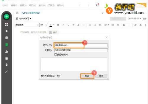 4在电子邮件笔记页面,输入【收件人】邮箱地址,点击【发送】即可。
