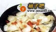 2炒锅置火上,加入花生油烧热,下入葱末、姜末爆出香味。放入白菜略炒。