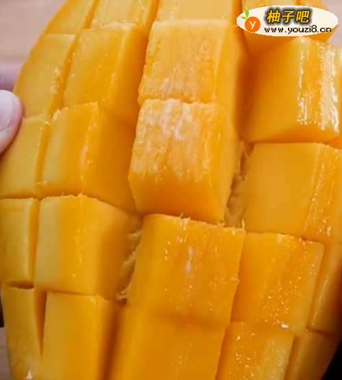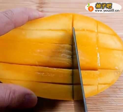 芒果沿着核对半切开,在果肉上画十字刀