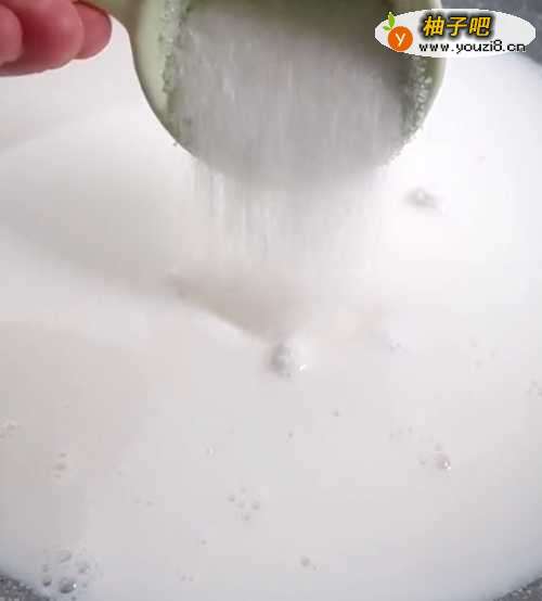 3小锅中倒入牛奶、凉粉、白糖,小火煮开、边煮边搅拌