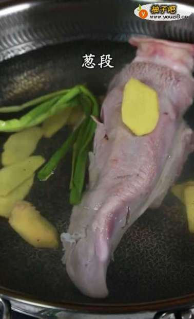 冷水下锅放入口条,倒入料酒、生姜片、葱段,焯水20分钟煮熟