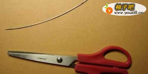 3然后,根据文具盒的长度,左手拿铁丝,右手拿剪刀剪出一段铁丝出来,如下图所示。