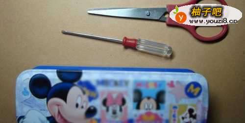把需要修理的文具盒和工具准备好,这里需要用到小起子,铁丝、剪刀,如下图所示。