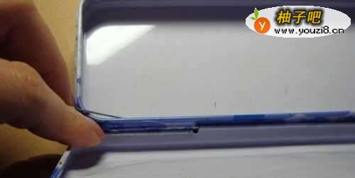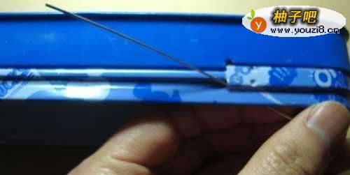 5然后,把盒子的反面靠近文具盒的槽,让铁丝从这里穿过来,如下图所示。