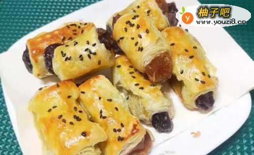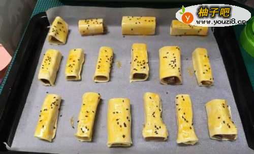 3将年糕卷入酥皮中,上面用叉子戳洞,在烤盘上铺烘焙纸,依序放好卷好的年糕,刷上蛋黄液,撒上芝麻