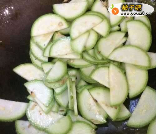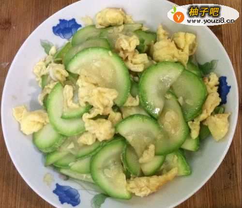 6下角瓜片煸炒,放一点盐,炒熟后下鸡蛋一起翻炒。炒一会就关火起锅。