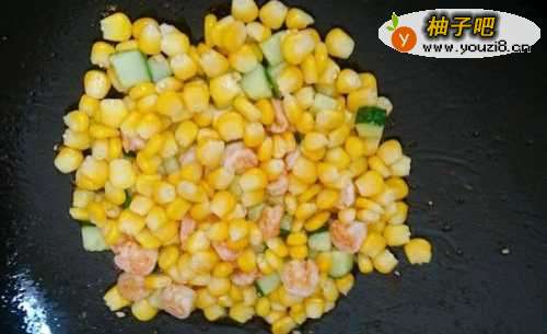 5下入煮好的玉米粒,翻炒三五下,随即调入适量食盐,翻炒均匀后便可出锅装盘。