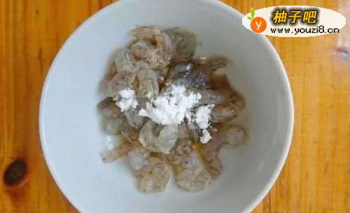 2虾仁里依次倒入1茶匙料酒,半料勺白胡椒粉和1茶匙生粉,搅拌均匀后腌制5分钟。