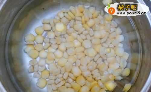 3锅中注水烧沸后,放1茶匙白砂糖,把玉米粒放下去煮5分钟,然后捞出控水沥干。(如果是玉米罐头就省略此步)