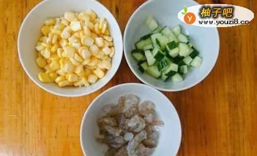 首先我们来准备食材:玉米粒是我用半根新鲜玉米剥的,大家也可以用那种甜甜的玉米罐头,可以省去煮制的时间。黄瓜洗净切丁,不用去皮,主要拿他来配色。虾仁我一般都是买鲜虾来剥的,如果你时间紧张的话,就用现成的虾仁吧,然后切点蒜末备用。