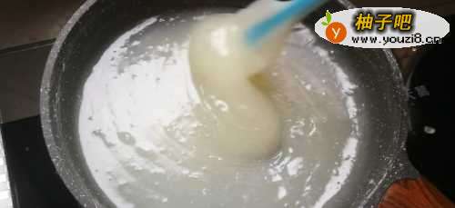 2接下来,将4等份的水倒入锅中,将面糊倒入面包中,煮沸时搅拌,煮至透明且粘稠。