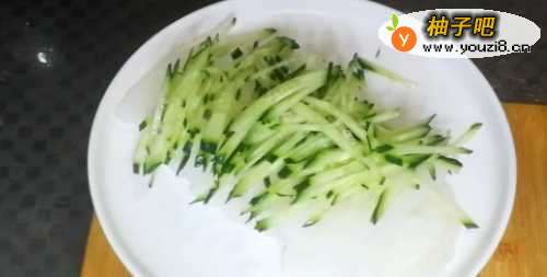 4然后,等凝固后,取出切成条状,切丝黄瓜。
