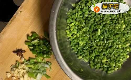 5另起油锅薪良,葱蒜翻炒,放入蒜苔,加入少许耗、盐