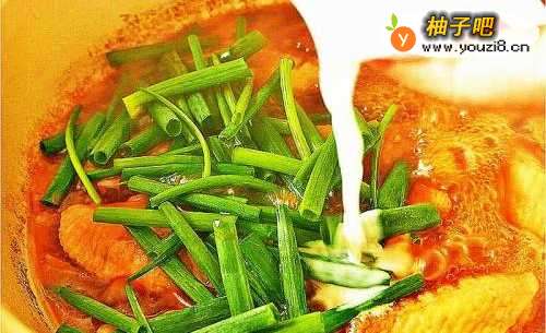 4打开盖,调至中大火,加入葱绿,把水加入生粉中拌匀,再倒入锅中。